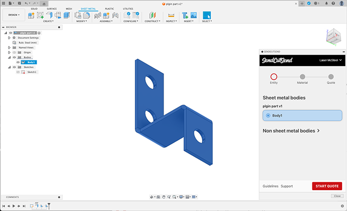 The SendCutSend plugin will automatically detect any sheet metal bodies in your design. You’ll need to set up parts using Fusion’s sheet metal tools even if you plan to order non-metal materials.