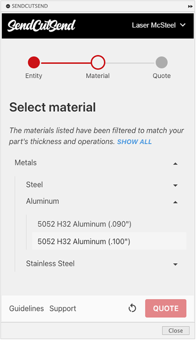 Installation is easy. In a matter of three clicks you’ll be able to select materials, view live quotes and parts to your SendCutSend cart!