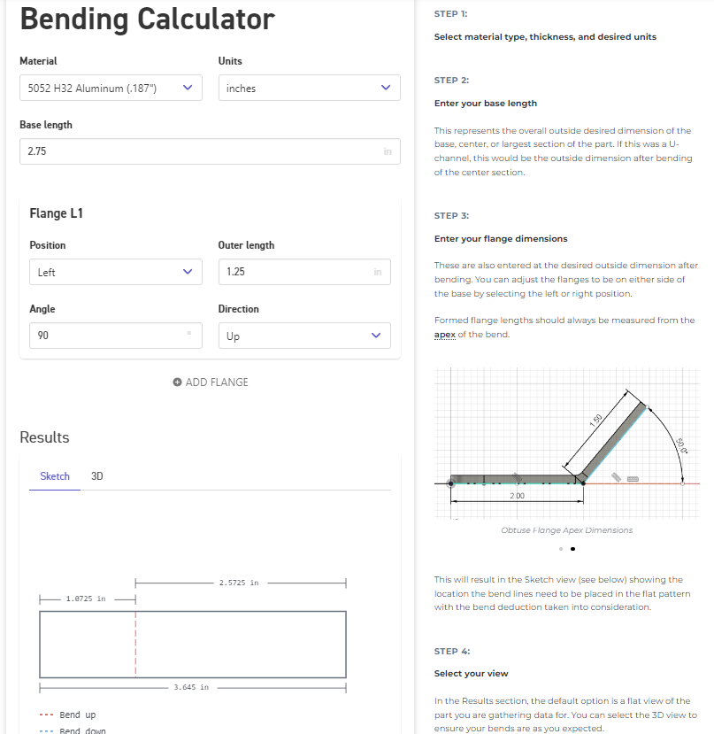 - Bend Radius – Each material and set of tooling used to bend it will produce unique bend geometry. Cardboard won’t have the same bend radius at ⅛” steel, but that’s ok. There are plenty of tools available to make sure your parts come out correctly. A lot of CAD software includes sheet metal tools that will do the calculations for you. All the materials SendCutSend bends have their properties listed (bend radius, K factor, minimum flange lengths, etc). If you’re going with a more manual approach, you can also use our Bend Calculator.