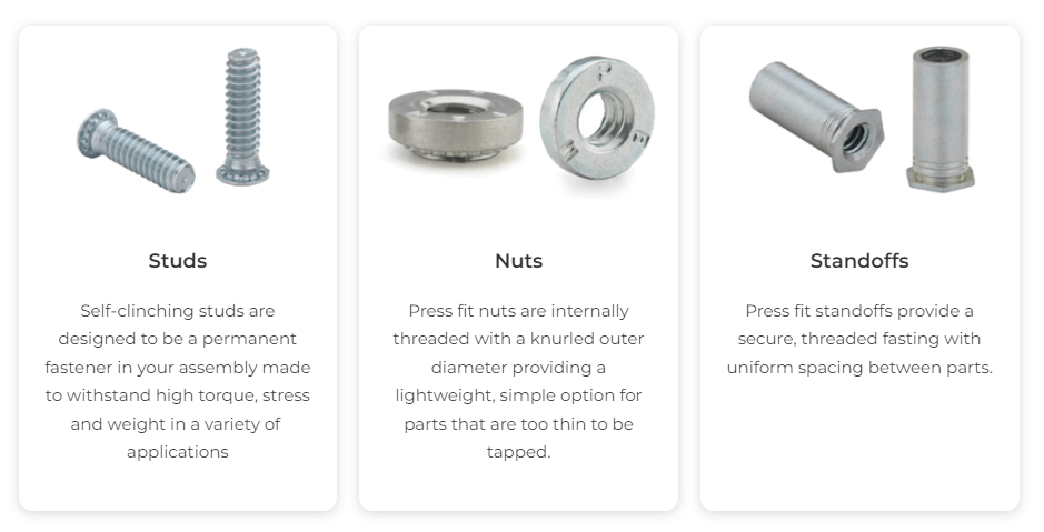 When it comes to self-clinching fasteners, SendCutSend offers these installed into your custom laser cut parts as a service. Check out the catalog for all the available types and sizes.