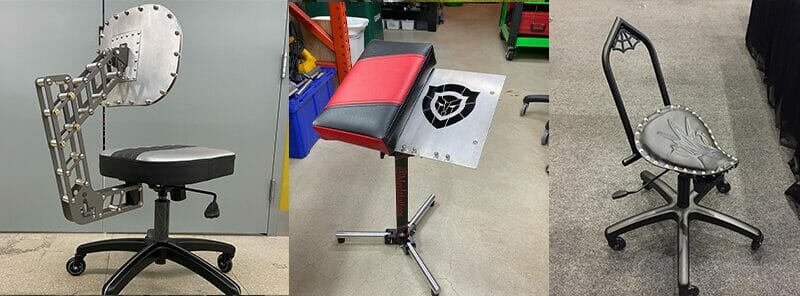 Jarry doesn’t limit himself to metal parts, laser-cut or not. There’s also fabric and leather, which he sews on the machine he inherited from his grandmother. The decision to begin building tattoo furniture “seemed like a strange thing to get into,” Jarry added, but considering that he’s been out of school for 17 years and this is the job that’s kept his attention the longest, it was probably a smart move.