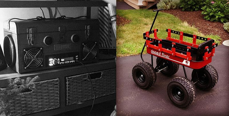 A glance at his website or Instagram page abundantly illustrates this point. Aside from the coffee tray just mentioned, there’s an LED-lit door-turned-chalkboard that he repurposed from an old metal cabinet. There’s a Bostitch nail gun lamp, a “Sit Symbol Chair” with laser-cut steel brackets (ludicrously priced), and a Jarry-ized version of the classic children’s wagon—the Rigged Flyer—equipped with off-road tires that would be equally at home on a lunar rover. And as a one-time guitar repair technician, Jarry’s into music (but prefers the drums), so of course he built a boombox out of a beat-up Craftsman toolbox.