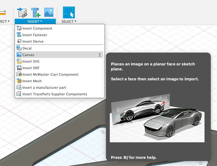 The subsequent task is to utilize the canvas function within Autodesk Fusion to integrate the captured photo into the project.