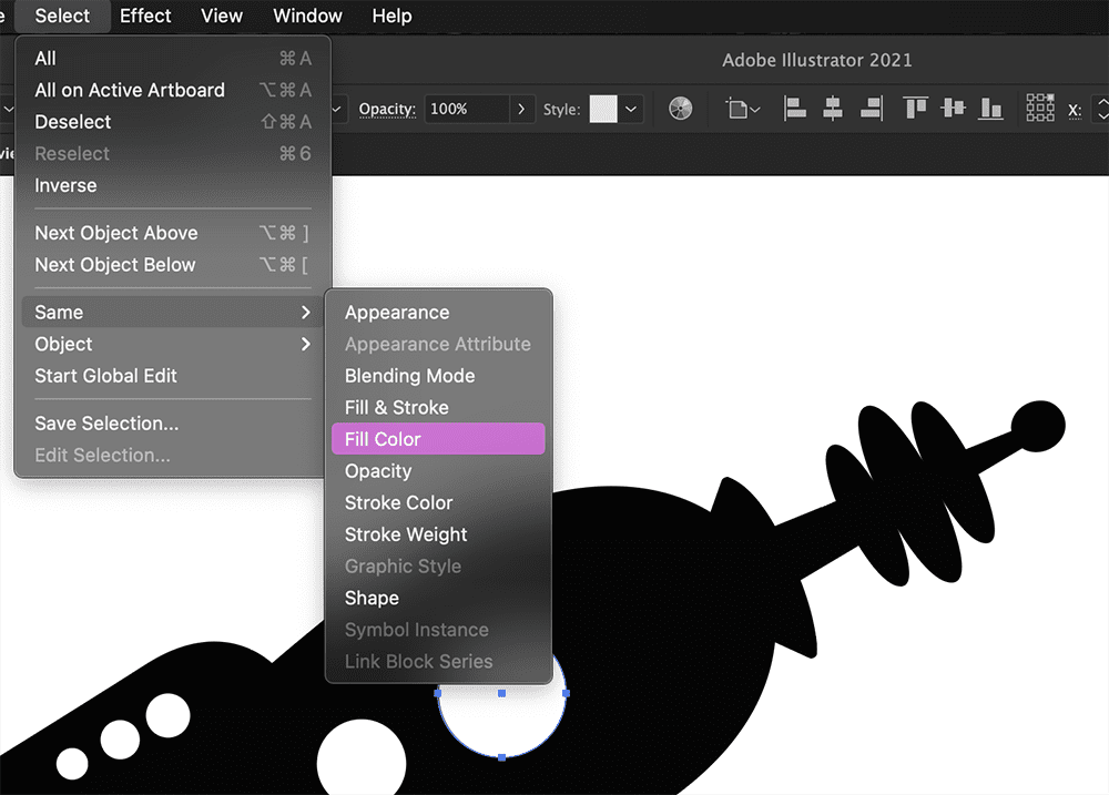 We can delete all negative spaces at once by first selecting one of them with the Direct Selection Tool, followed by Select > Same > Fill Color. This will select all of our negative spaces because they share the same white fill color, then simply hit the Delete key on our keyboard.