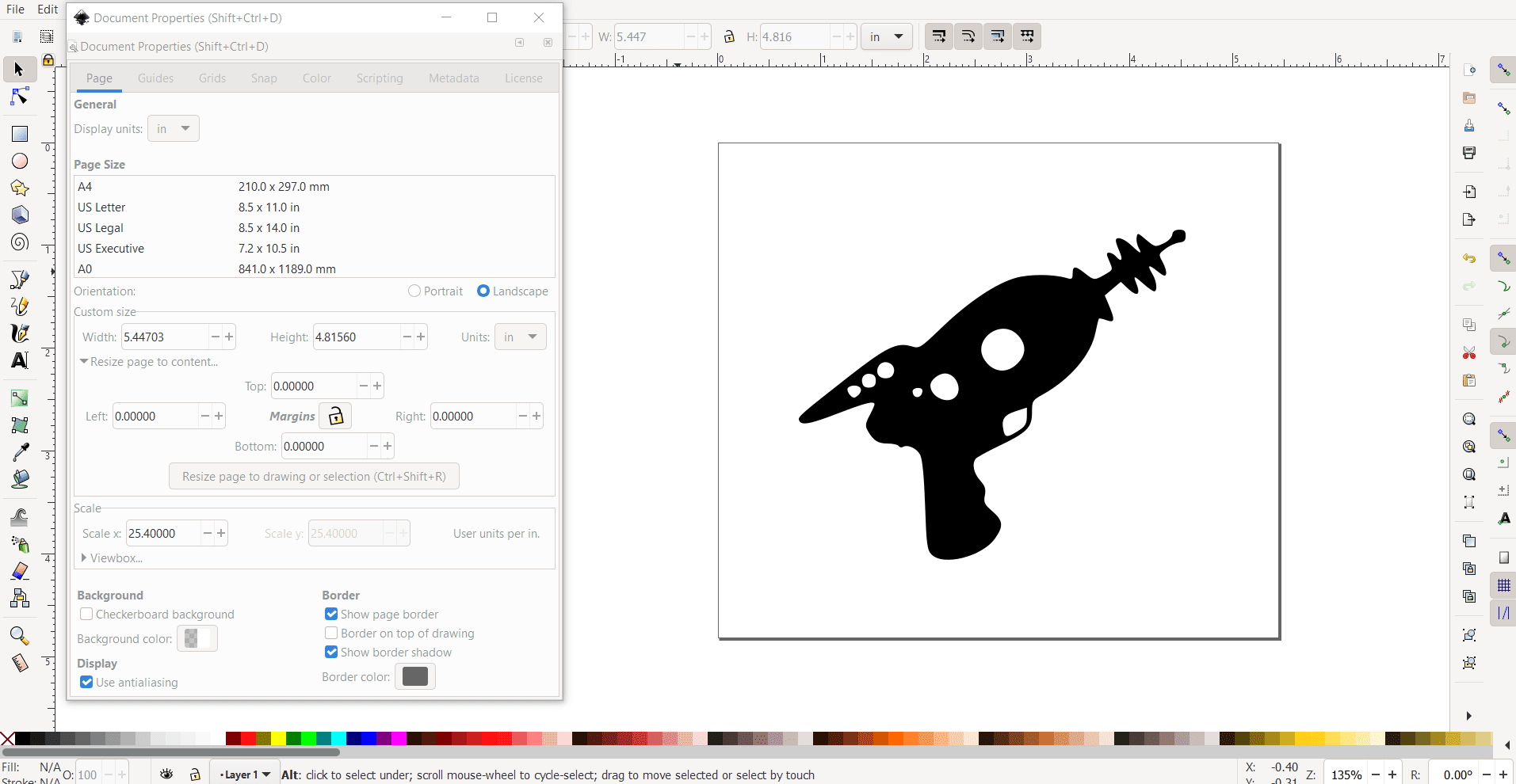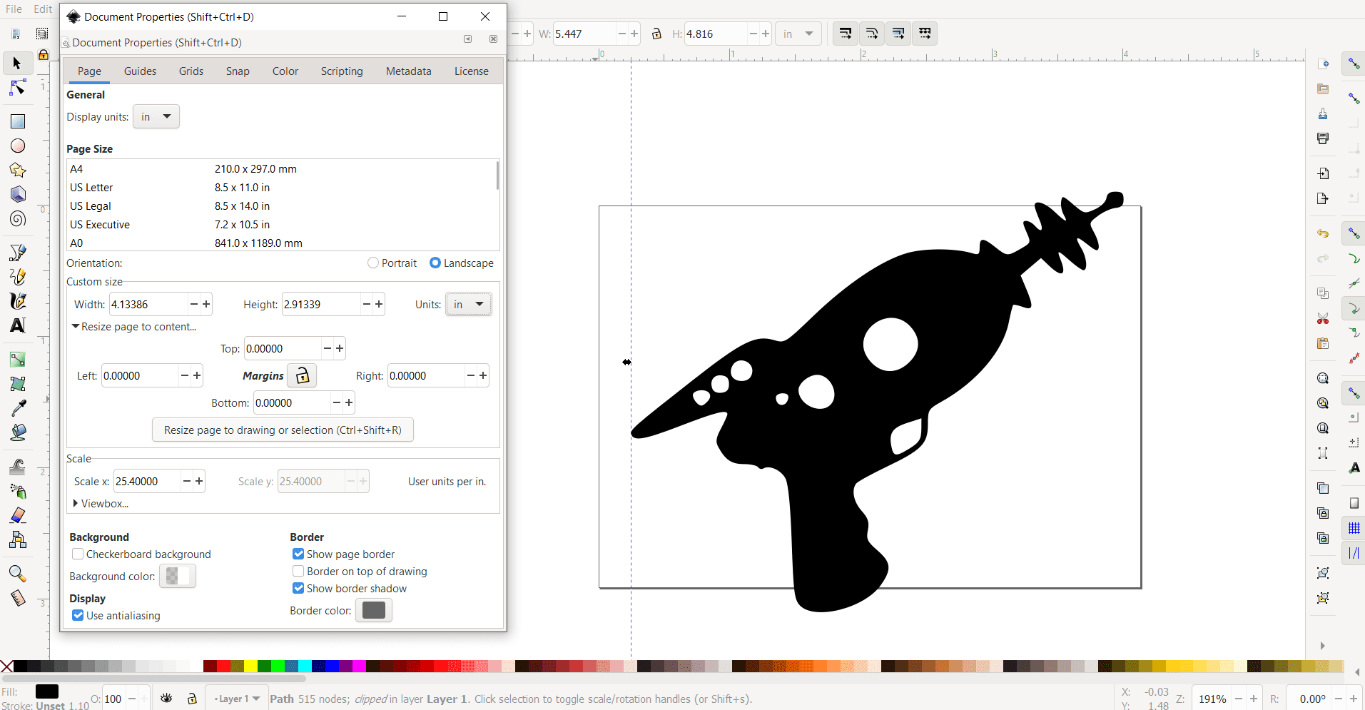 Finally, make sure all your artwork fits within the artboard. While the artboard doesn’t act as a border or a cut line on your final design, the artboard border will cut off anything left outside of it during exporting. To do this, go to the Document Properties under File (or you can use the hotkeys Shift+CTRL+D). Under Custom Size, select the dropdown next to Resize Page to Content and click Resize Page to Drawing or Selection. This will automatically resize the artboard to include all of your artwork with room to spare.