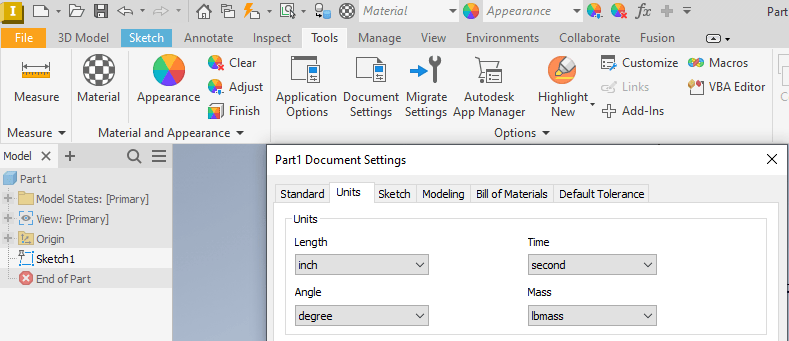 Design your part using either inch or millimeter units. You can update the units for your Inventor project by navigating to the Tools tab, opening Document Settings, and choosing either inch or millimeter from the drop down menu before clicking Apply.