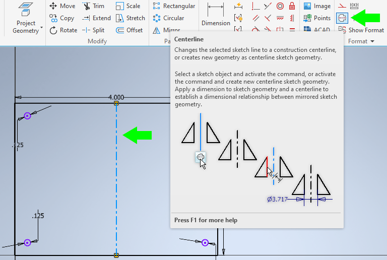 To draw your bends, indicate the center of each bend with a line and apply the Centerline setting to make it dashed. Your bend location line will indicate where the press brake’s punch contacts the part in order to form the flange.