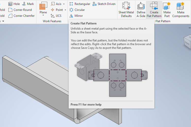 After your model is set up with our sheet metal specifications and the design is finalized, click Create Flat Pattern.