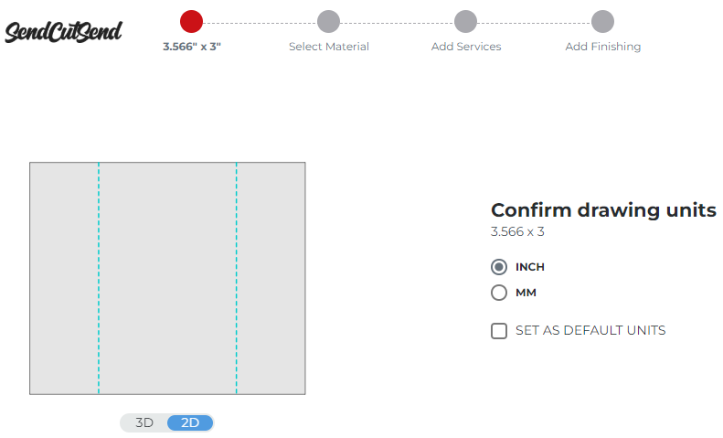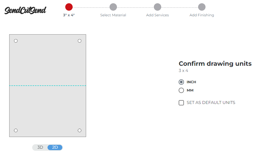 If you added bend lines, they should show as blue dashed lines. After selecting a material thickness that we bend, you’ll be able to configure the bend angle and direction for each bend line at the Add Services step in our pricing system.