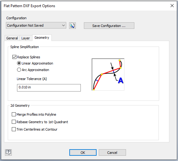 Under the Geometry tab, the Replace Splines box should be ticked with Linear Approximation selected and a tolerance of about 0.010 inches. This setting works well for most files and should be the default.