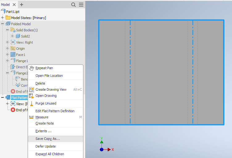 When your flat pattern is created, right click on Flat Pattern and then choose Save Copy As.
