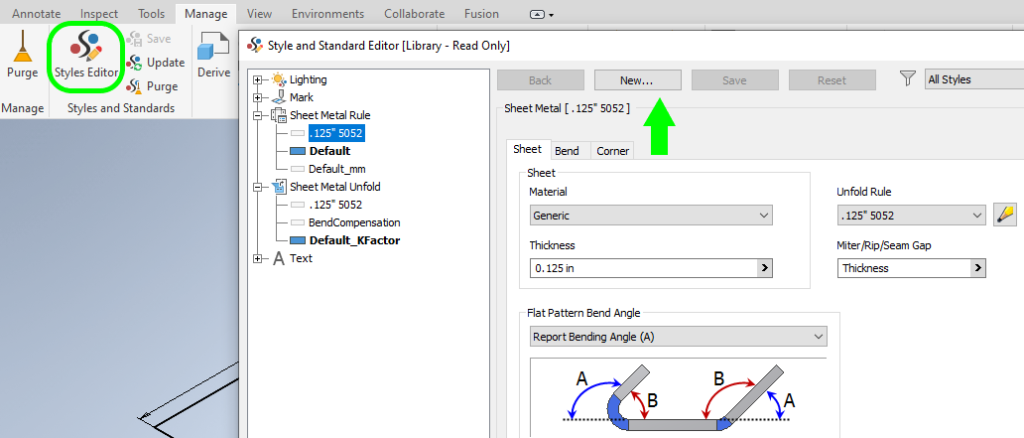 You can create new sheet metal rules in Inventor by navigating to the Manage tab, opening the Styles Editor, selecting the default rule, and then clicking New.