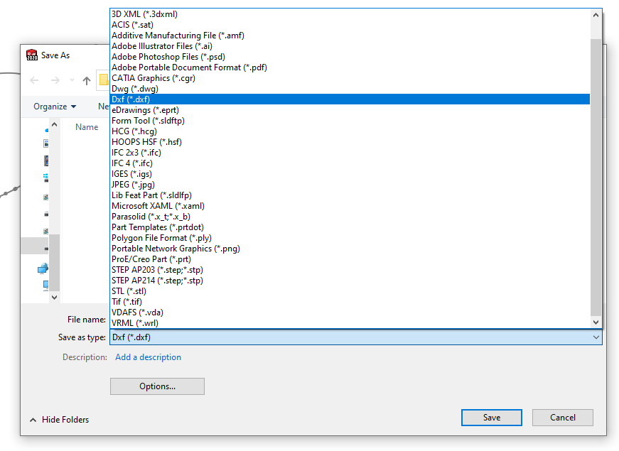 You can export a DXF of an entire part or assembly simply by using the “Save As” command and changing the file type to DXF. We don’t recommend this method to produce DXFs for cutting as it pulls in all the geometry. Just know that it is possible if you need to create a DXF for other purposes.