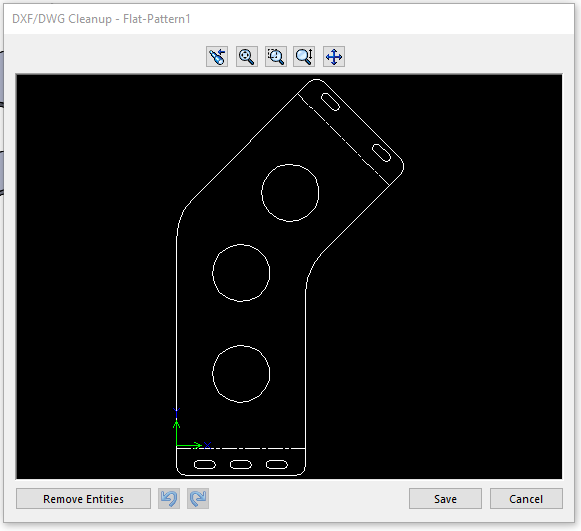 Just like the other methods, this will bring up the DXF/DWG Cleanup window. You should see the flat pattern of your part with bend lines as dashed lines. You can remove any unwanted lines here by selecting them and clicking the “Remove Entities” button. If everything looks good, select “Save” and your DXF will be created.