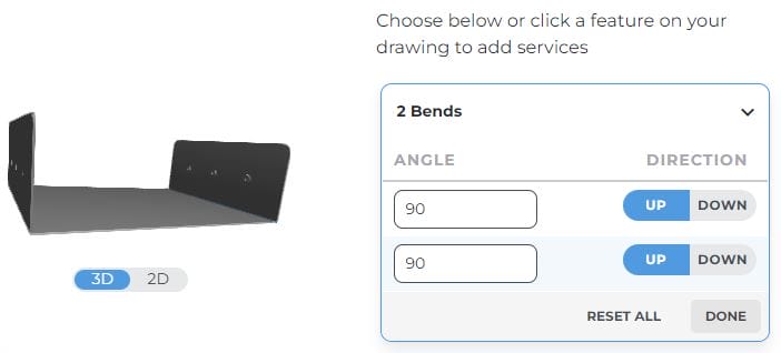 You can adjust the angle to whatever your part requires as long as it falls within our bending guidelines. If you input an angle that is lower or higher than what is possible, it will autocorrect up or down to the minimum or maximum limit for the material thickness.