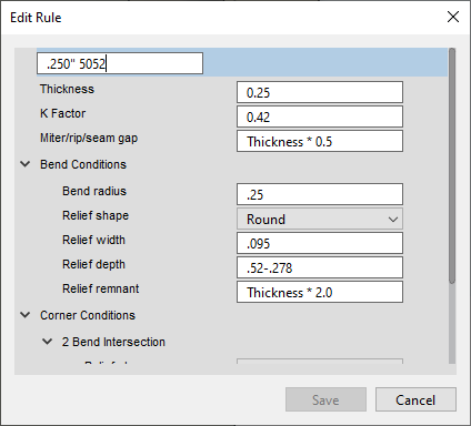 Here you can specify many of the sheet metal specific properties including bend radius, K-factor, and bend relief dimensions. These can be fixed values or formulas based on the material thickness. (Note: you can find all of this information for your chosen material and thickness in our bending calculator as well.)