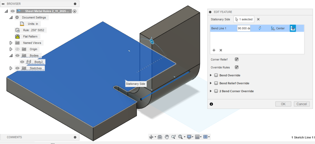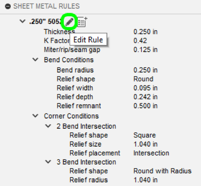 In Fusion there are two locations to control bend relief: you can control the default settings for your design and you can override the default settings for each individual bend if you need to.