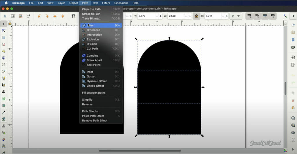 All of your shapes will need to be Unioned from the Path menu. This is particularly important if you drew shapes that overlapped with each other. Unioning the shapes will ensure they result in one contour for the laser to follow.