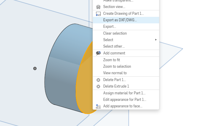 Exporting a flat part in Onshape is quick and easy. First you will click the face of the part you want to export. Next, right click on the face of the part, then select “Export as DXF/DWG…”