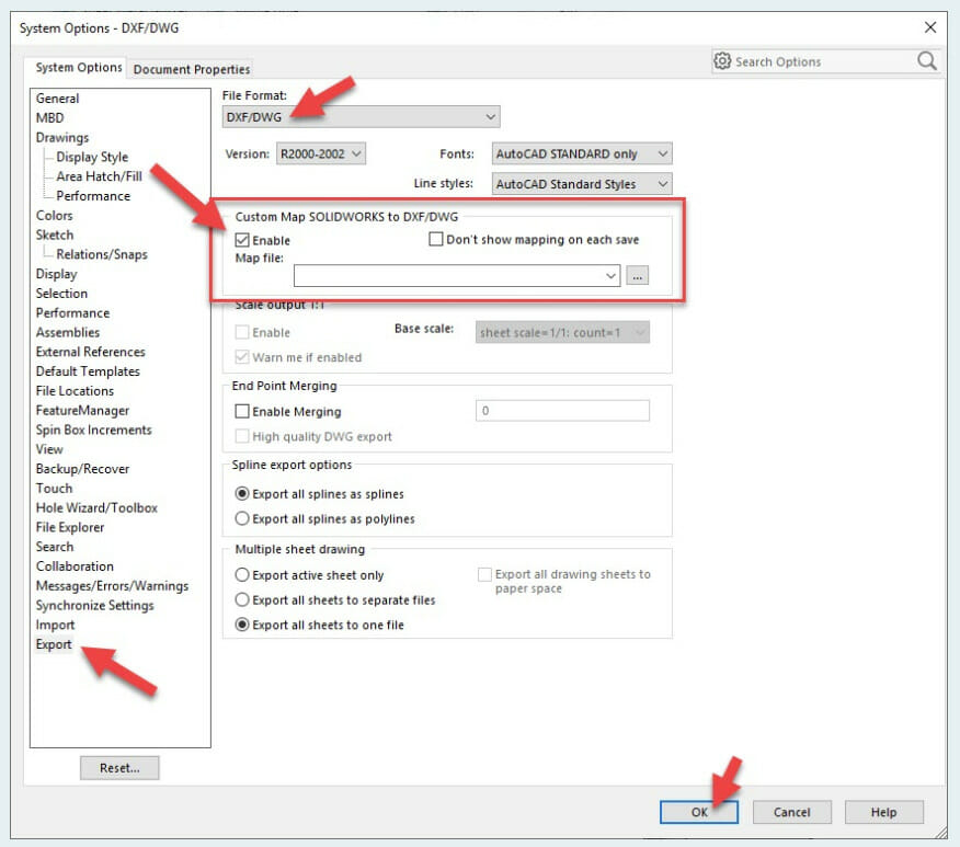 1. As before, be sure to enable custom mapping from SolidWorks to DXF/DWG