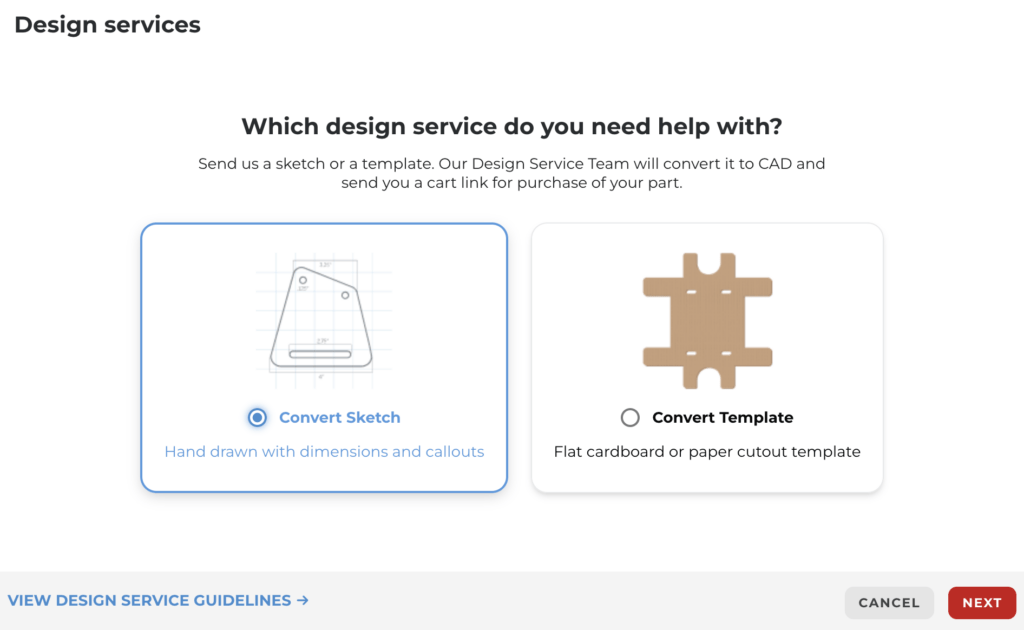 If you’re new to CAD or do not have the skillset to create the part you want, we have you covered. Our in-house Design Services allows you to send a sketch of your part to our team and we’ll create a CAD file for you. Here’s how to get started with Design Services.