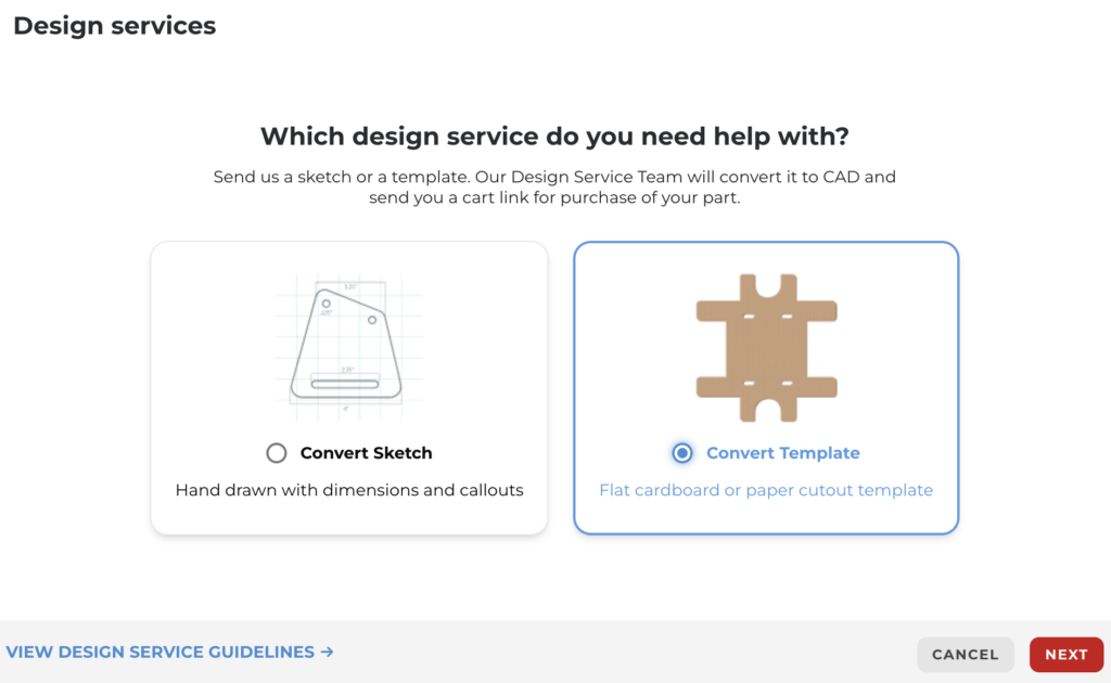 The second option for Design Services is to start from a cardboard template. Similar to starting with a sketch, you’d create a template version of your part that you’d send to SendCutSend to turn into a CAD file, here’s how.