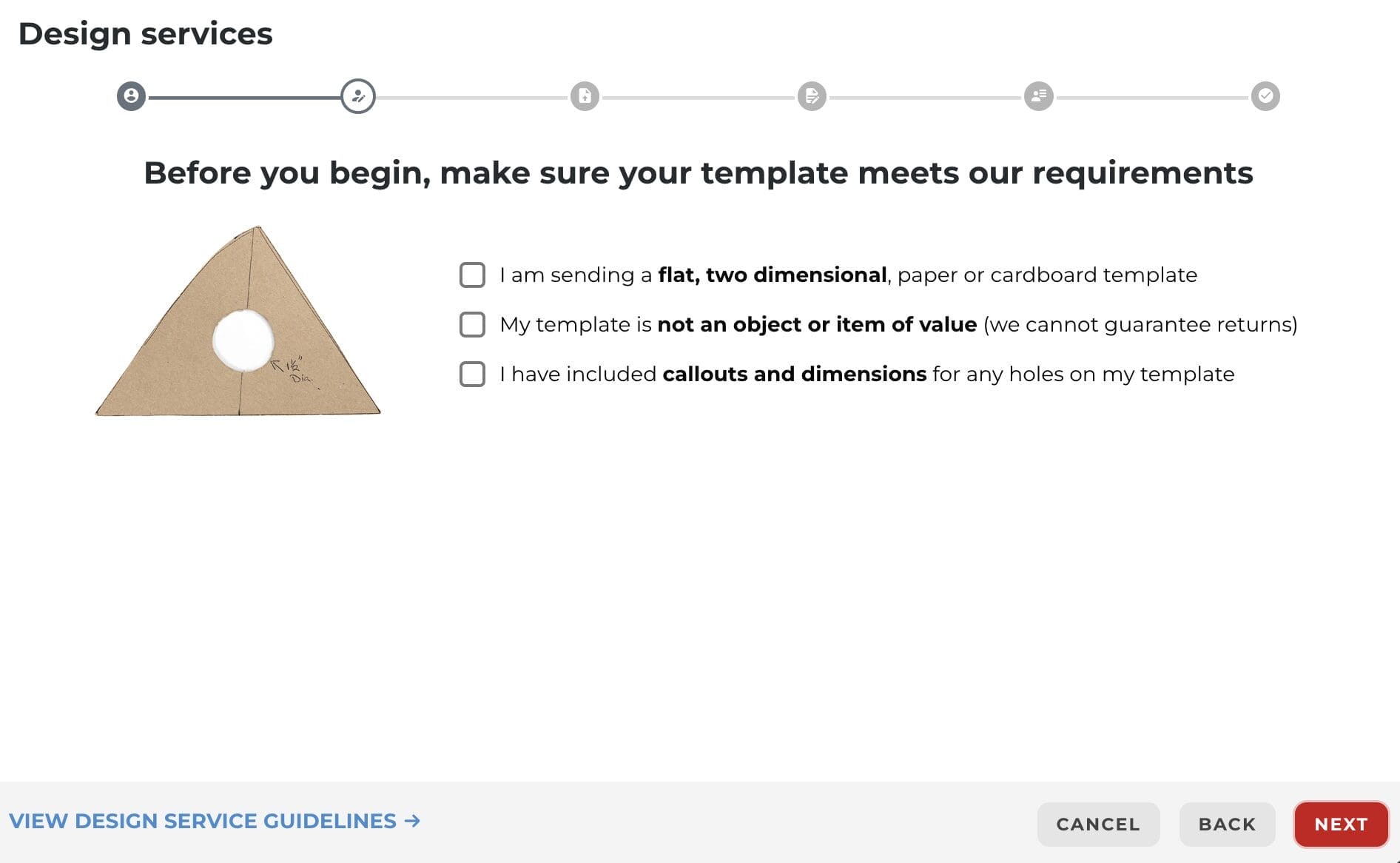In order to meet our design services requirements templates need to be flat, two dimensional and on paper or cardboard. Seeing as you will be mailing us your template, it cannot be an object or item of value as we don’t promise it will be returned. You also must include any callouts and dimensions for any holes.