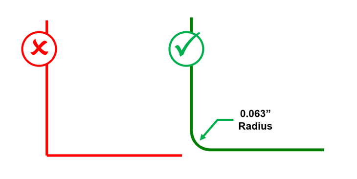Because the inner corners of a CNC routed part cannot be sharper than the diameter of our cutter (we only use ⅛” bits), all interior edges must have a radius of 0.063” or larger. Also note, only two-dimensional cuts are possible. No threading, countersinks, 3D contour, V grooves, partial depth cuts, or double-sided cuts.