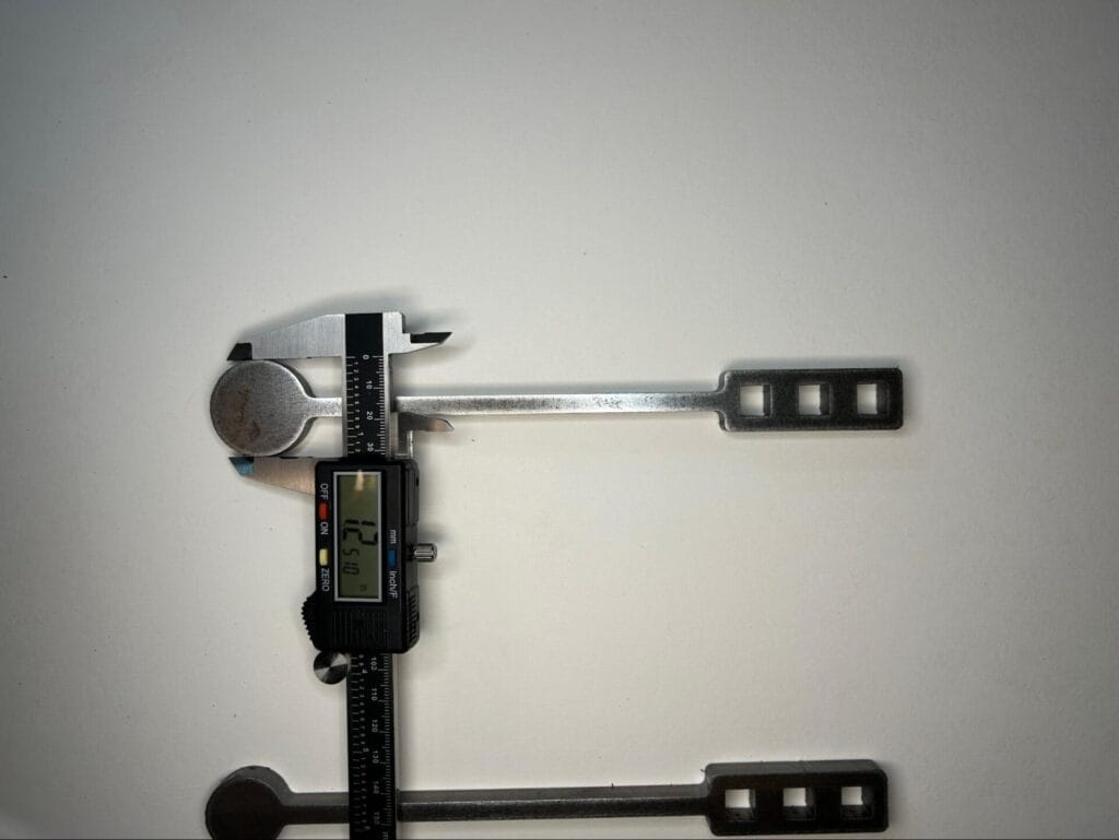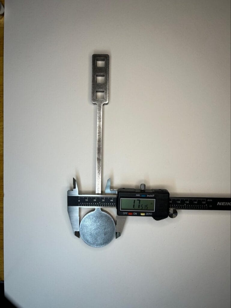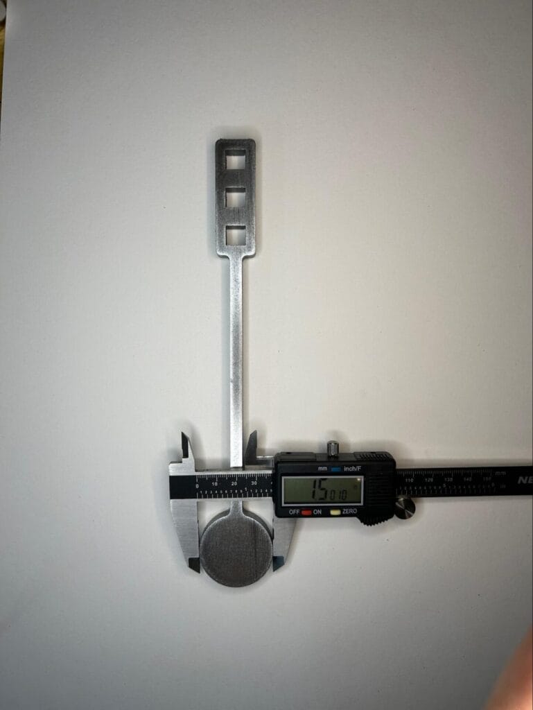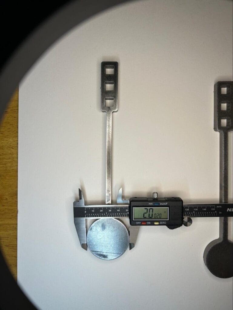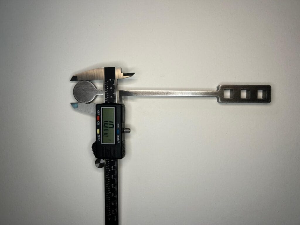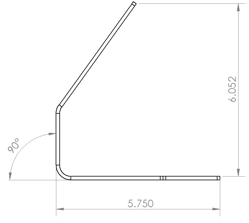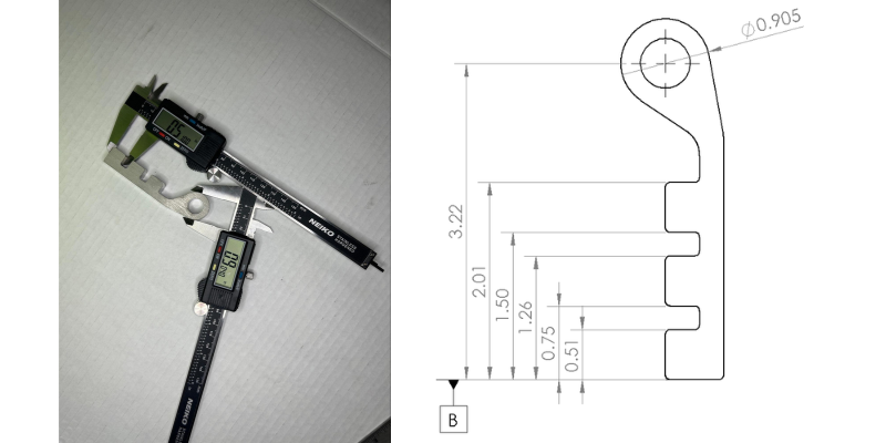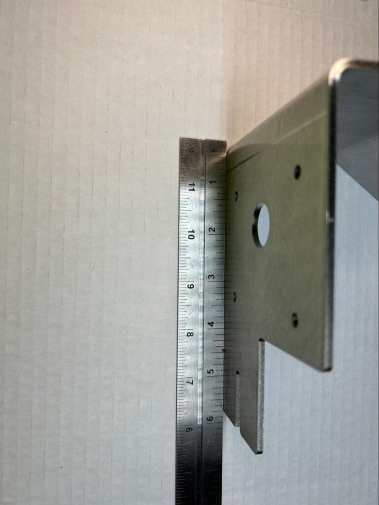 In the images above the bent stainless steel part matches the drawing dimensions. The square cleanly aligns with the front corner, and the base of the part measures 5.750” when the edge of the ruler aligns with the front face of the part.