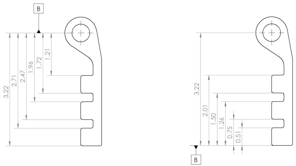 In the example above, the key shaped piece is drawn two separate ways, with the circular feature as the datum, and with the flat end as the datum. The circular datum conveys that distance from the circular component is the most critical for proper function. The flat end datum conveys that dimensions relative to the flat end of the part are more important.