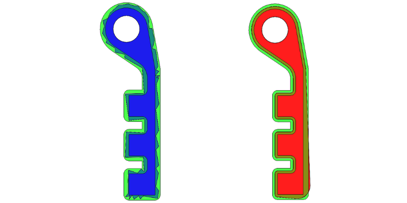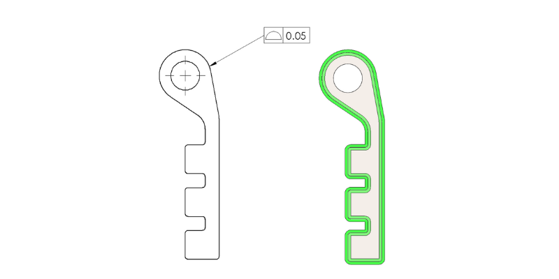 In the above example, the blue part on the left is very roughly cut, but it is within the surface tolerance specified, thus it passes inspection. The red part on the right however fails inspection because it goes out of the tolerance zone in the lower right corner. This highlights the importance of being intentional with which tolerances are specified
