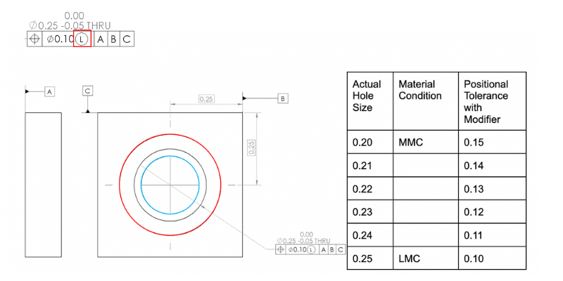 The above drawing shows a tolerance with the least material condition modifier, LMC. The red circle indicates the outer bounds of where the hole edge can fall while still being in tolerance, whereas the blue circle indicates the inner bounds. The table to the right shows the positional tolerance relative to actual hole size. Note that when the hole size is at LMC condition, or 0.25” hole diameter, the tolerance matches the number in the drawing, and you get “bonus tolerance” as the hole size gets smaller.This modifier ensures a minimum hole to edge thickness is maintained.