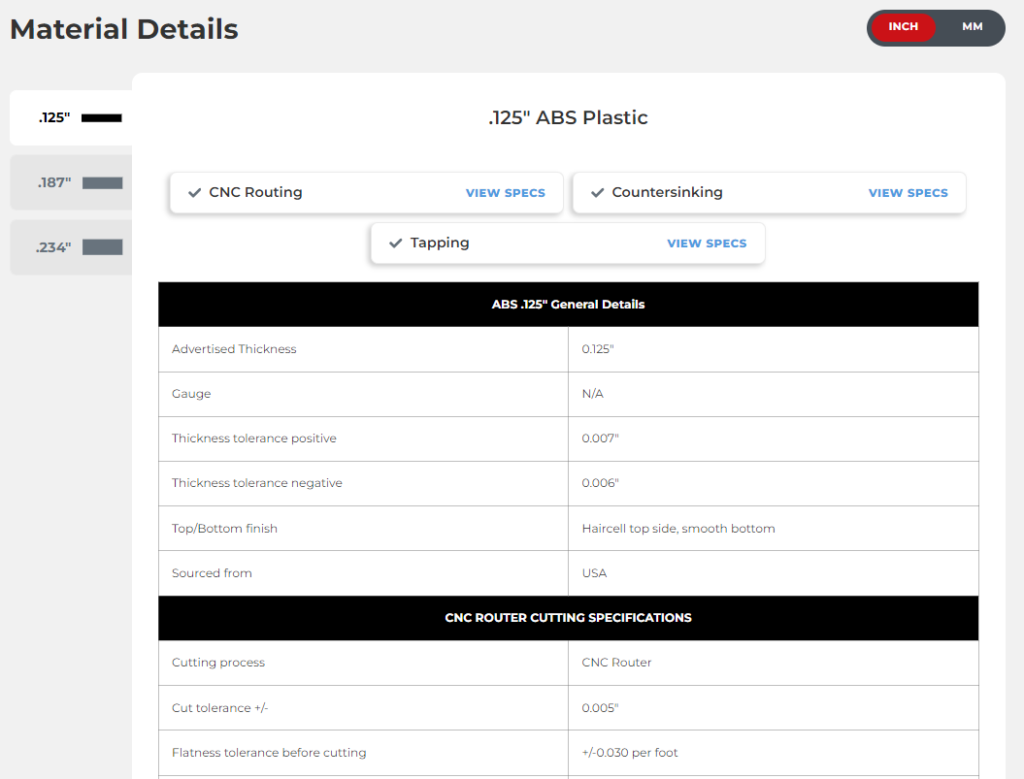 Above are the material details found on SendCutSend’s website for ABS plastic. Note that the tolerances vary for thickness tolerance, cut tolerance, and flatness tolerance.