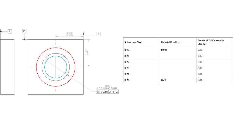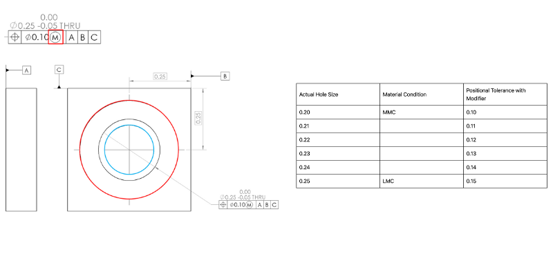 The above drawing shows a tolerance with the maximum material condition modifier, MMC. The red circle indicates the outer bounds of where the hole edge can fall while still being in tolerance, whereas the blue circle indicates the inner bounds. The table to the right shows the positional tolerance relative to actual hole size. Note that when the hole size is at MMC condition, or 0.20” hole diameter, the tolerance matches the number in the drawing, and you get “bonus tolerance” as the hole size gets bigger.This modifier ensures a minimum clearance is maintained.