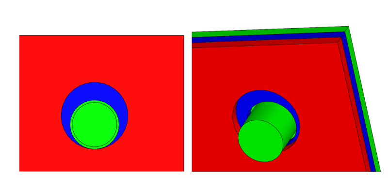 Tolerance stacking is the summation of tolerances from multiple parts and how they interact. For instance, if an assembly has 3 critical parts that must fit together, each of them must fit regardless of if any combination of the maximum or minimum tolerances are hit for each interacting feature. What starts as a small tolerance can grow to be fairly large when multiple tolerances stack together. In the example below, there is a locating pin feature that aligns three plates together. There are multiple tolerances that must be accounted for in order for the parts to fit together properly: the location of the pin, the size of the pin, the diameter of the green plate’s thru hole, the position of the green plate’s thru hole, the diameter of the red plate’s thru hole, the position of the red plate’s thru hole. Keeping tolerance stacking in mind will maintain proper design functionality, while also allowing for proper tolerances to be specified.