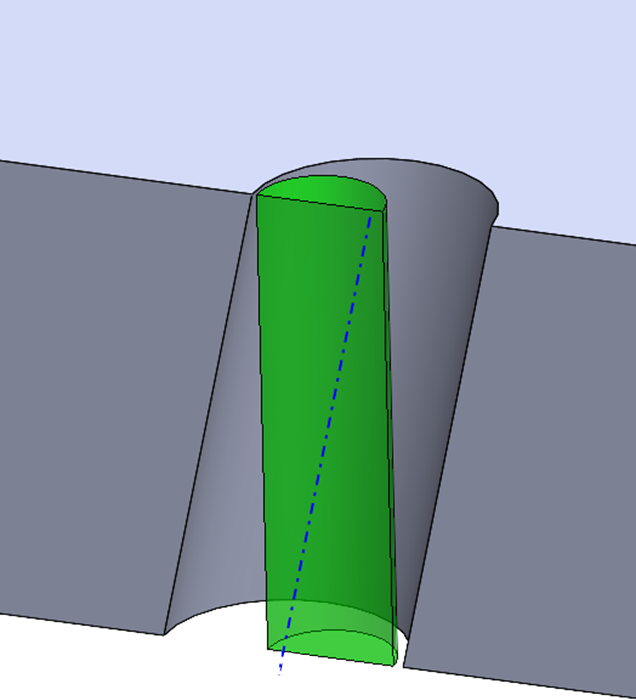 In the image above, a hole has been drilled that is clearly not perfectly normal to the bottom face of the plate. However, it is still within the green cylinder representing the acceptable position tolerance, so it passes inspection.