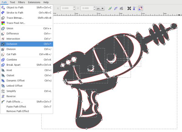 We’re going to start by using the “edit path by nodes tool” (F2) to select all the shapes. Then under the “path” menu, I’m selecting “exclusion.” The exclusion tool will cut the white shapes out of the gray, creating one cohesive shape that I can send to the laser.