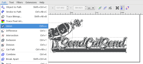 Now that I have a continuous path I can merge my shapes. Using the “edit path by nodes” tool (F2) again, I’ll select all the shapes. In the Path menu, I’ll select Union. This will merge all my shapes into one. You can double-check that your objects have merged correctly by viewing the file in “outline display mode” again. The lines should no longer be overlapping and the object will be laser cut cleanly without any unwanted cuts.