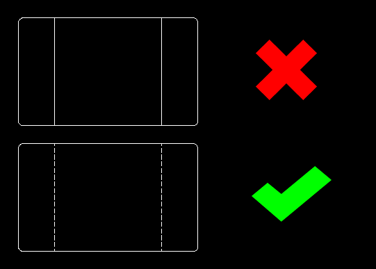 To avoid this, make sure any cut features are outside the die line, or Die Width/2 away from the bend location line.