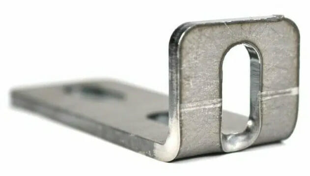 Hardware is installed after parts are bent. It’s important to ensure the hardware mount holes are far enough away from bends and that flanges for 4-sided box bends are short enough to allow access to the installation points.