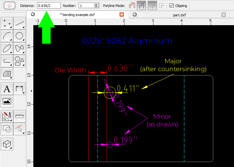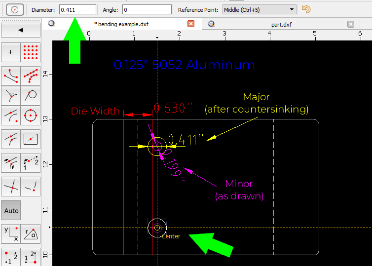 Therefore, you’ll need to check the die line width against the major diameter that will be present after your holes are countersunk.