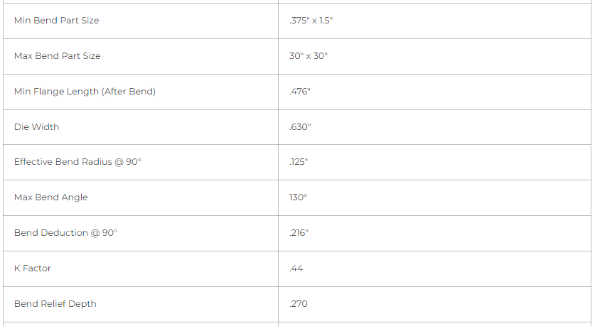 Then scroll down to the Design Considerations. The Design Considerations section for each material thickness is where you can find critical specifications for all available operations in one place.