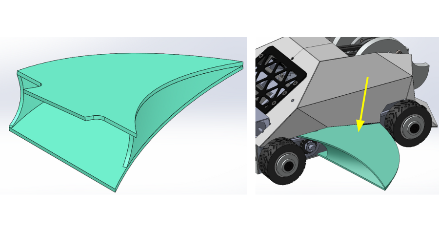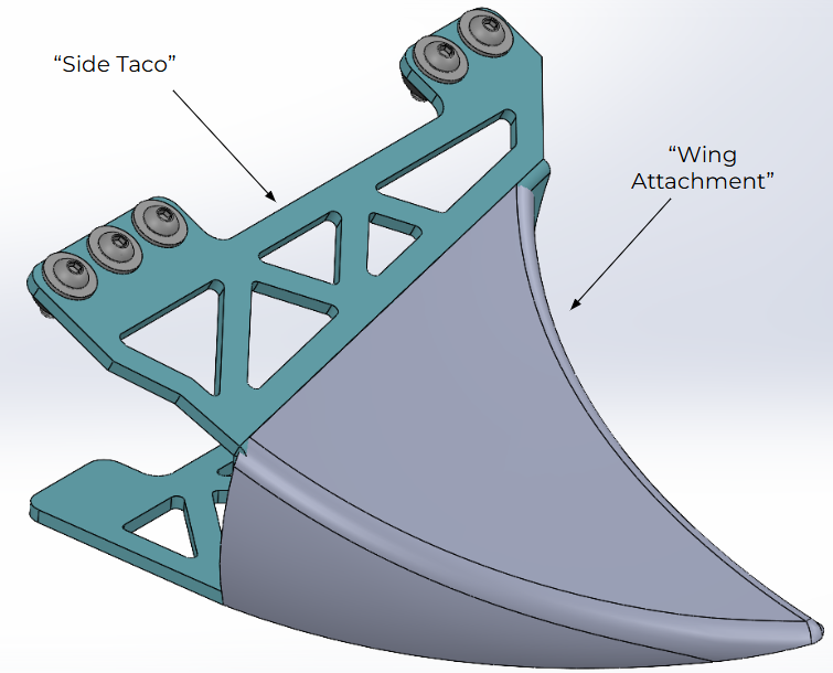 Our first version had a major flaw — the heat-formed UHMW panels were too cantilevered and couldn’t withstand the torque from big impacts around the mounting bolts (turns out, plastic panels don’t exactly scream “armor”). To preserve the wing-like silhouette while improving the overall durability, the team split the side pods into 2 parts: the “side taco” and the “wing attachment”. The side taco would be made from metal to handle the big impacts, while a 3D printed wing attachment could maintain Disarray’s signature shape.