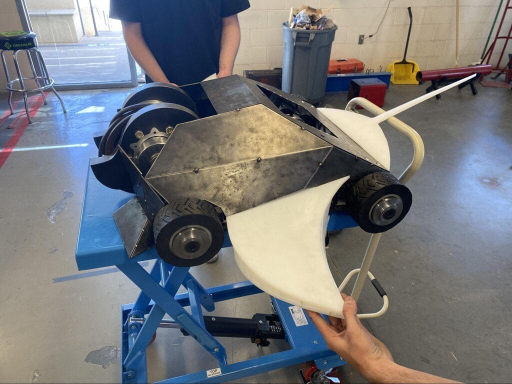 These flat-cut UHMW panels served two purposes: they provided a layer of protection for the drive chain and helped define the robot’s distinctive stingray-inspired silhouette. We were also able to heat-form the UHMW to create smooth, contoured surfaces.
