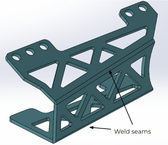 For the side tacos, alloy steel seemed like a strong candidate thanks to its rigidity, but it came with a serious weight penalty. To offset that, we used an isogrid pattern — a cutout design strategy that maintains strength while shedding weight. This new approach eliminated the need for time-consuming forming of the UHMW, but introduced a new manufacturing step: welding together three SendCutSend steel plates into a single structure.