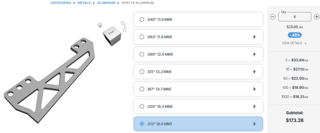 Uploading these bent parts to SendCutSend was simple. We exported each unique part as a STEP file, uploaded it to the online quoting tool, and that was it. SendCutSend automatically detected the bends, calculated the flat pattern, and retained the correct bend angles.