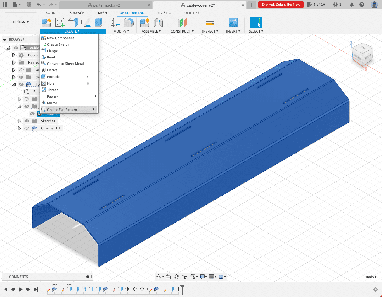 Our preferred CAD program is Autodesk Fusion, which is completely free for hobbyists. If you are designing your bent part using Autodesk Fusion’s sheet metal feature, you can either export your design as a STEP file or a DXF file.