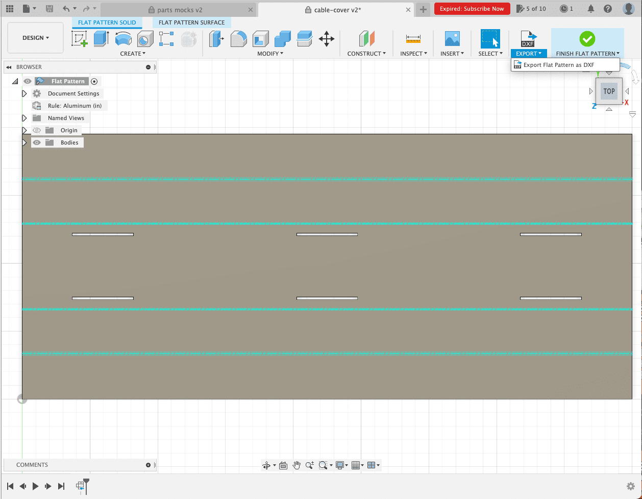 If you followed our above instructions for Autodesk Fusion, the bend lines will appear automatically with the “Create Flat Pattern” function. They will default to a solid line, which is our preference for bent sheet metal parts designed in Fusion. To achieve correct bend lines in Autodesk Fusion, you will need to define the dimensional thickness of your part, convert it to sheet metal, create a flat pattern (as shown above), export as a .dxf, and in the “Export as a .dxf” dialogue, select “Convert splines to polylines.” This will result in 3 solid lines to export. The center line will automatically be detected in the SendCutSend app for bending.