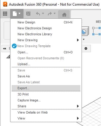 With your 3D part modeled in Autodesk Fusion, navigate to File > Export.