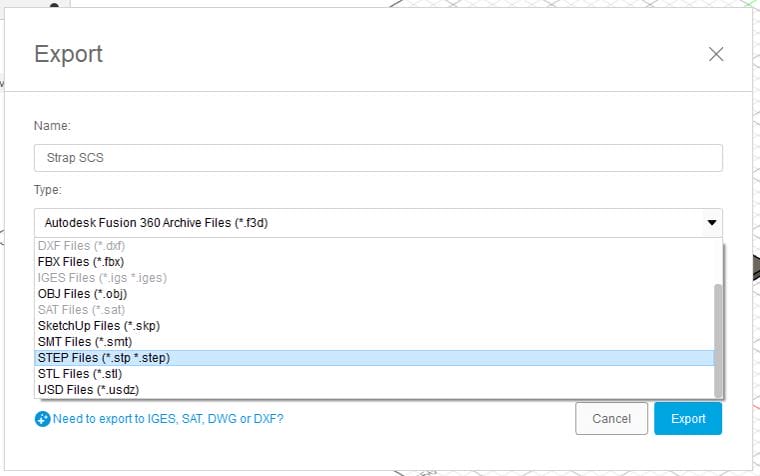 This will open the Export window. Name your file. Then, in the Type drop down menu, choose STEP Files (*.stp *.step).